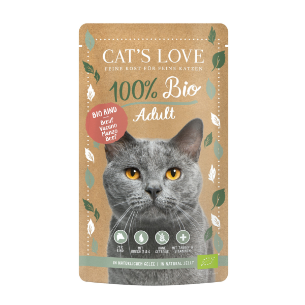 Cats Love Bio Ternera es un alimento húmedo natural hecho con ingredientes certificados de agricultura ecológica. Su fórmula rica en ternera (71 %) proporciona proteínas de buena digestibilidad y sabor intenso, ideal para aportar variedad y nutrición saludable a la dieta diaria del gato. Sin aditivos sintéticos, está pensada para una alimentación completa.