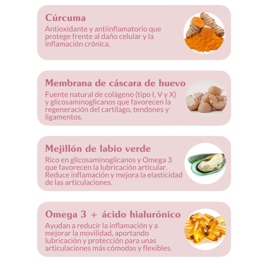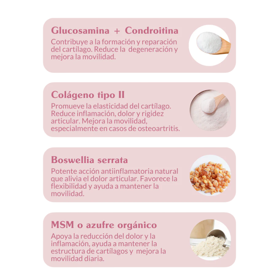 - Fórmula 13 en 1: integramos trece ingredientes que actúan de forma sinérgica para cubrir todas las fases del desgaste articular.