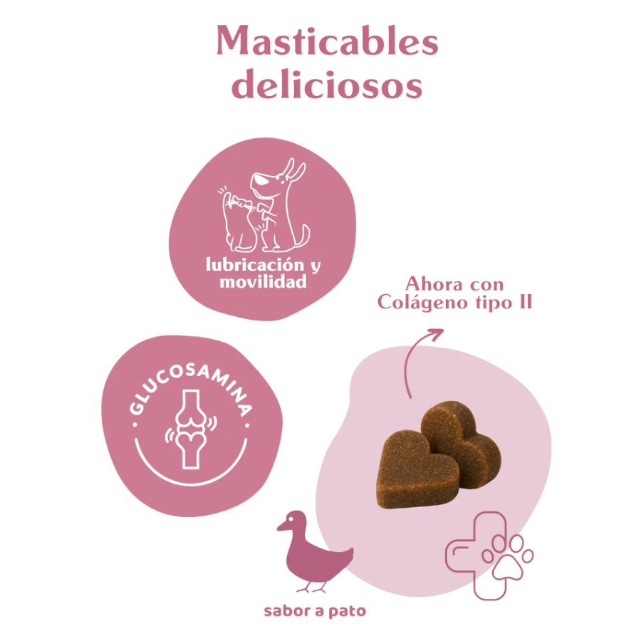 Ingredientes activos por chew (4 g): Omega 3 560 mg (EPA 100 mg y DHA 68 mg), Sulfato de Glucosamina (400 mg), Boswellia serrata (400 mg), Sulfato de Condroitina (320 mg), Metilsulfonilmetano MSM (250 mg), Cúrcuma orgánica (160 mg), Mejillón de labio verde (150 mg), Membrana de cáscara de huevo (110 mg), Colágeno tipo II no desnaturalizado (100 mg), Vitamina C como ácido ascórbico (52 mg), Ácido Hialurónico (50 mg), Vitamina E como d-alfa tocoferol (20 mg), Piperina de pimienta negra (3 mg).