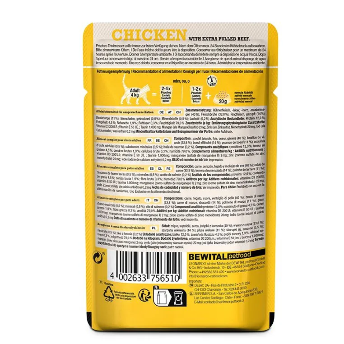 LEONARDO Chicken + extra Pulled Beef es un delicioso paté de pollo combinado con carne desmenuzada, que ofrece a tu gato una experiencia de sabor única. Cada porción es cocinada suavemente y enriquecida con aceite de salmón.