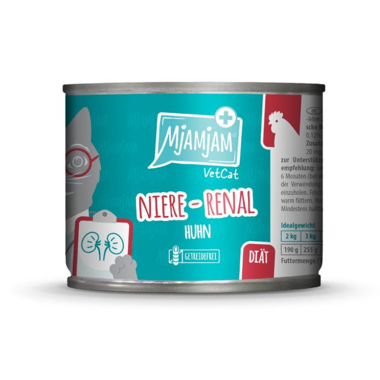MjAMjAM VetCat Riñón – Renal se ha desarrollado especialmente para favorecer la función renal normal de tu gato con insuficiencia renal crónica. Este alimento dietético de alta calidad para gatos contiene sólo un tipo de carne por variedad y está exento de cereales, gluten y lactosa, lo que lo hace especialmente digestible.
