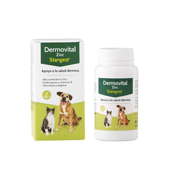 Dermovital Zinc de Stangest es un suplemento nutricional formulado para apoyar la salud de la piel, el pelo y las mucosas en perros y gatos. Su composición está orientada a cubrir déficits de zinc y otros nutrientes clave, ayudando a mantener la integridad cutánea, la calidad del manto y los procesos normales de regeneración de la piel.
