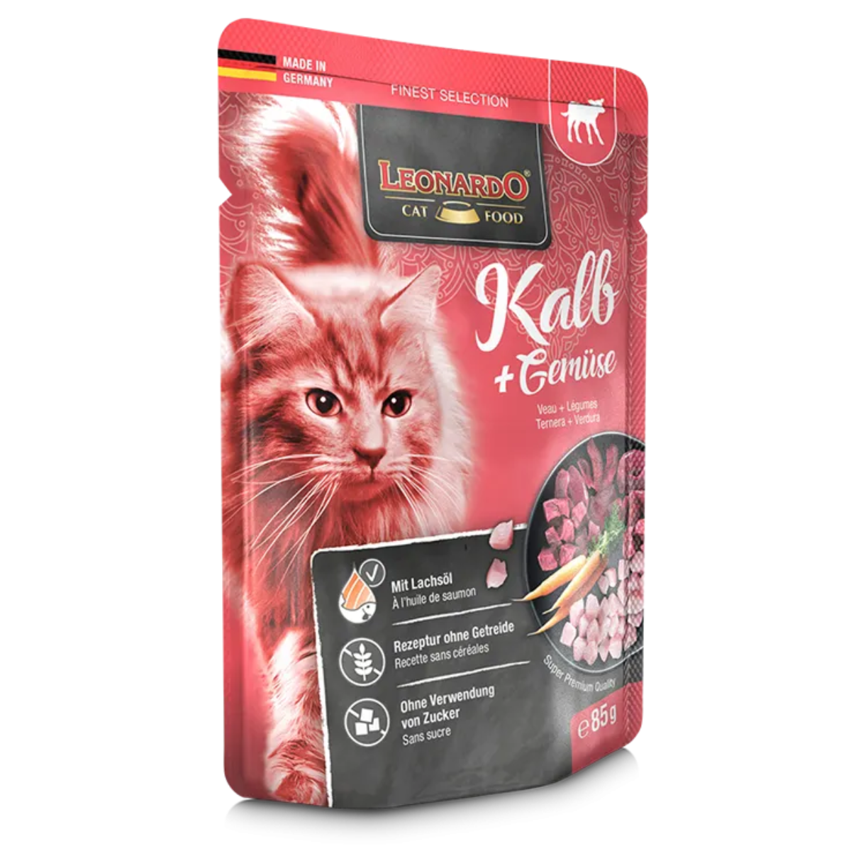 Aquí triunfan los amantes de las verduras: además del ingrediente principal, una tierna carne de ternera de primera calidad, LEONARDO Ternera + Verduras contiene lo mejor del huerto en forma de zanahorias cuidadosamente cocinadas. El aceite de salmón con ácidos grasos poliinsaturados también hace brillar el pelaje.